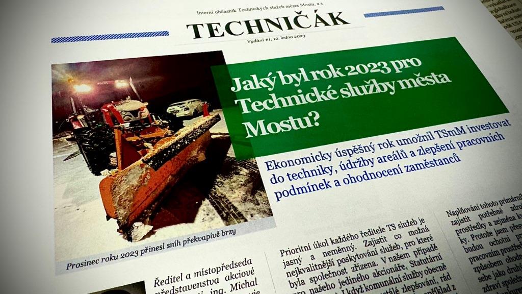 Pro vylepšení informovanosti v rámci našeho podniku jsme začali vydávat vnitropodnikové noviny. Zaměstnanci se v nich dočtou o plánech a získají mnoho dalších informací, které se většinou týkají právě jich. Noviny budou vycházet vždy, když se nám povede naplnit jejich obsah přínosnými informacemi. Jsme tu nejen pro Vás, ale i pro naše zaměstnance, Technické služby města Mostu.
