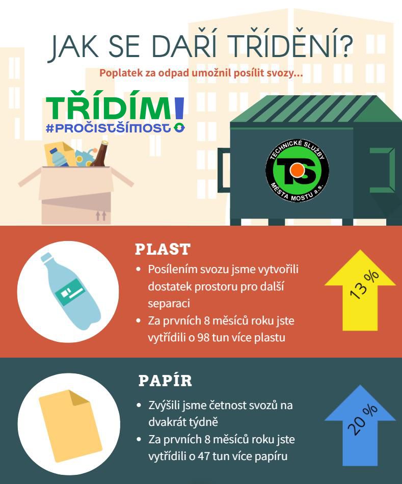 Po obnovení poplatků za odpad v našem městě jsme zintenzivnili svoz tříděného odpadu na frekvenci dvakrát za týden. Při meziročním srovnání za období leden až srpen 2024 oproti tomu samému období v roce 2023 jsou výsledky zvýšení četnosti svozů patrné. Množství separovaného papírového odpadu stouplo o dvacet procent a toho plastového o 13 procent. Celkem jsme tak na skládku nemuseli vyvézt 992 tun směsného odpadu, který dostal šanci na druhý život. Děkujeme, že třídíte s námi, a jsme tu pro Vás..