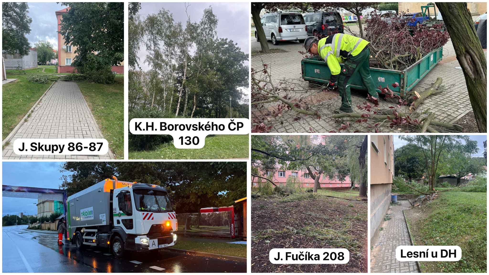 Skupova ulice, Borovského, Fučíka, Lesní, nebo prostranství u kostela je jen výčet z mnoha lokalit, kde jsme odstraňovali následky víkendových povětrnostních vlivů. Ulámané větve a mnohdy i celé stromy, u kterých nezbylo nic jiného, než je s těžkým srdcem odstranit. A k tomu všude spousta nafoukaného odpadu. V nasazení byly tři celé pracovní čety a spousta mechanizace. Všem patří za jejich obětavou práci veliké poděkování, protože bez nich by to nešlo. Jsme tu pro Vás…..